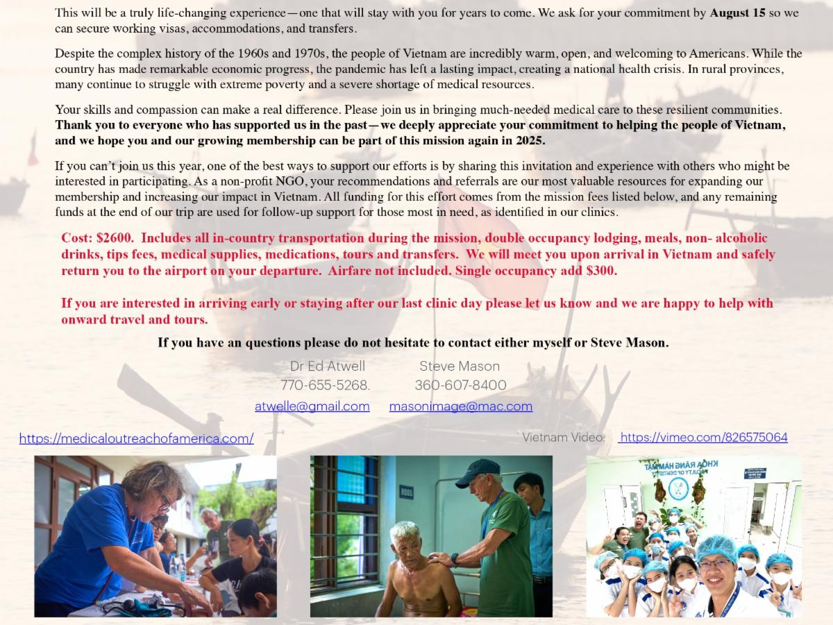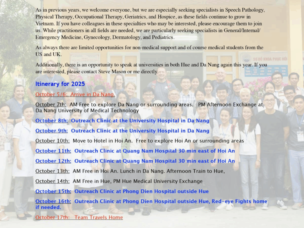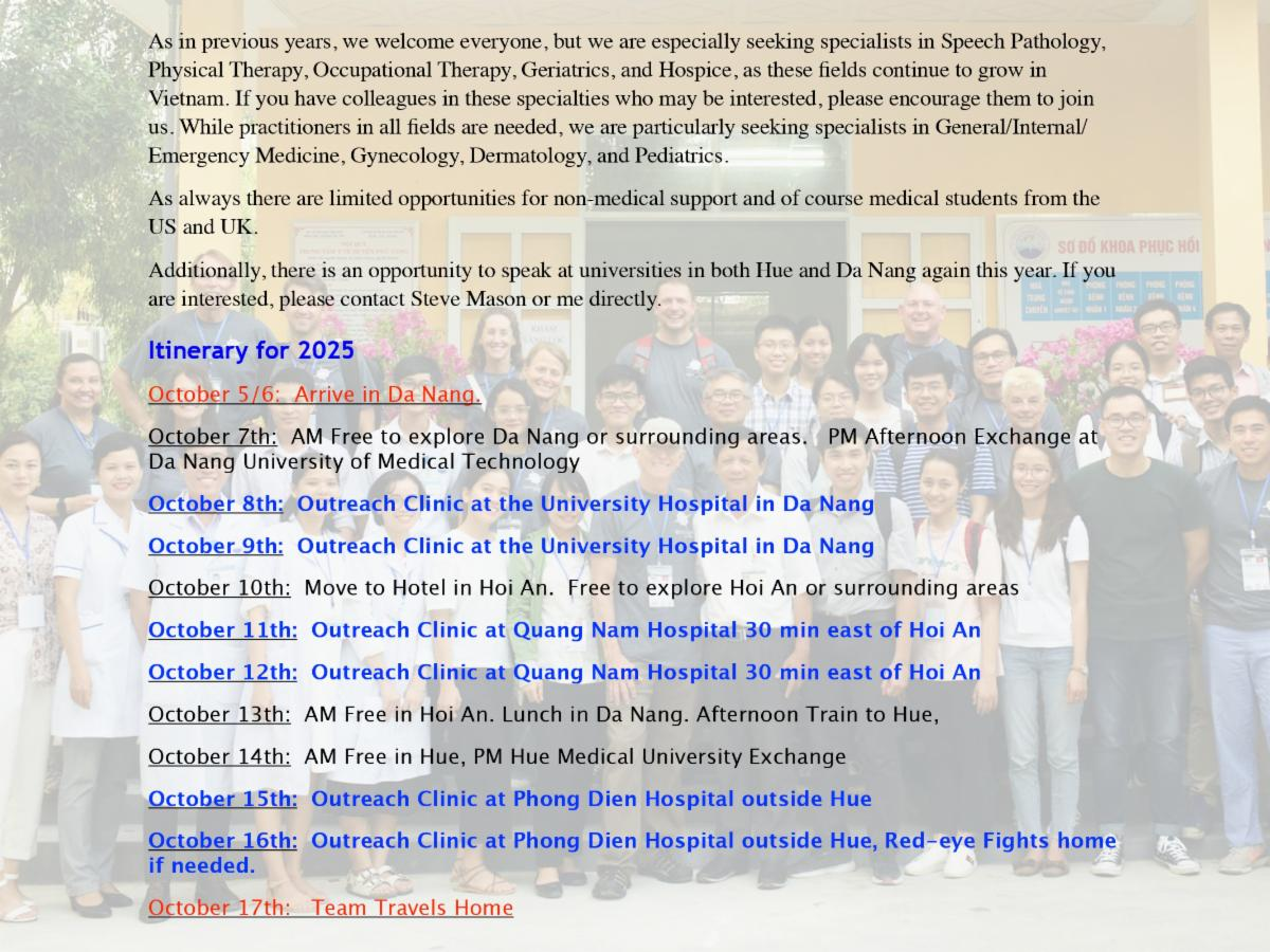 Medical Outreach of America is extremely pleased to offer the opportunity to return to Vietnam in early fall 2025. Building on our previous missions over the last five years, we will collaborate with our partners in Vietnam to deliver medical services to individuals suffering from permanent disabilities, UXO-related injuries, and the effects of Agent Orange exposure in the central region near Hue and Da Nang. Our mission will begin in Da Nang, where we will work alongside student partners from the Medical Technology and Pharmacy University. For two days, we will provide free clinics at the university hospital in Da Nang, treating victims of Agent Orange exposure and children with disabilities through our local NGO partners, DAVA and Children of Vietnam. Following our work in Da Nang, we will travel south to Hoi An, where we will enjoy a free day before conducting two days of clinics in the Quang Nam region, approximately a 30-minute drive from Hoi An. Here, we will continue collaborating with our student partners from Da Nang and the medical staff at the clinic. We are especially excited to work with a new partner there and serve a population impacted by dioxin exposure and years of chronic poverty. The next day, departing from Da Nang, we will take the new train service to Hue, traveling along the scenic coastline of central Vietnam in vintage railcars. This three-hour journey will be a highlight of our travels, featuring refreshments and entertainment as we pass through breathtaking mountainous terrain and remote shorelines connecting these two beautiful cities. Once in Hue, we will again partner with the Medical University of Hue for student and translator support, along with our local NGO partner, HUEFO. Over the course of two days, we will hold clinics at Phong Dien Hospital, located outside Hue City. Our experience there last year was incredible, and we look forward to returning once again. ![]() |